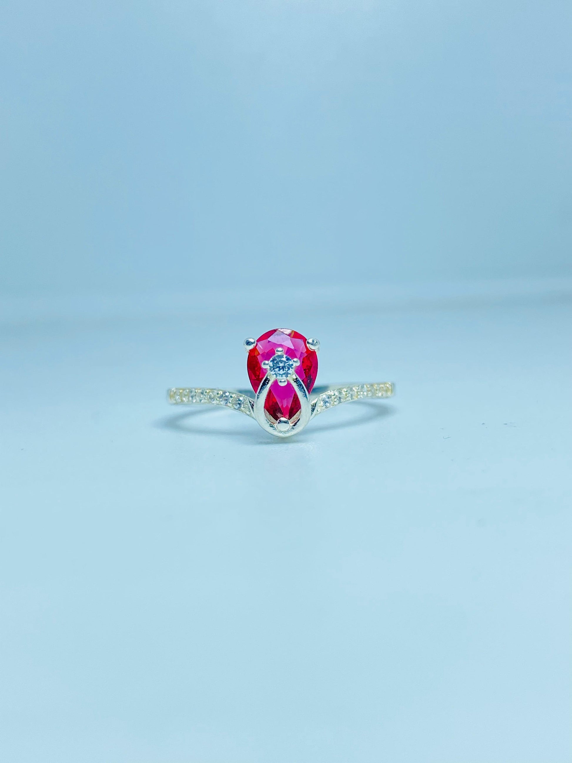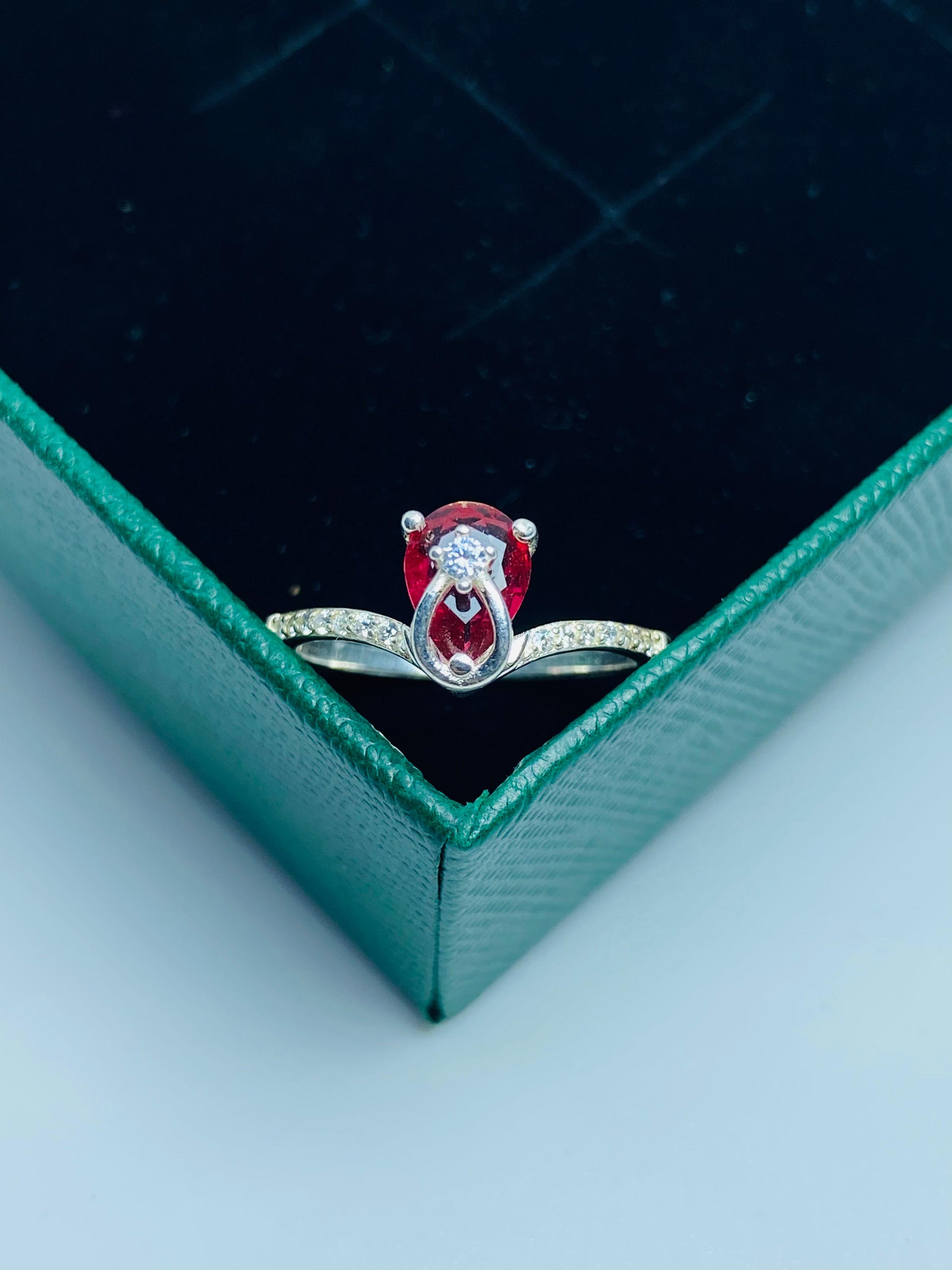A designed to captivate and dazzle with its regal charm. At the heart of this exquisite ring lies a radiant ruby, cradled elegantly in a delicate crown-inspired setting. The shimmering sides of the ring are adorned with intricately crafted designs, embellished with sparkling stones that enhance the brilliance of the central gem. This luxurious ring exudes sophistication and grace, making it a perfect choice for special occasions or as a timeless gift to celebrate a loved one. Crafted with the finest materials, the Ruby Radiance Crown Ring promises a lasting, unforgettable impression.