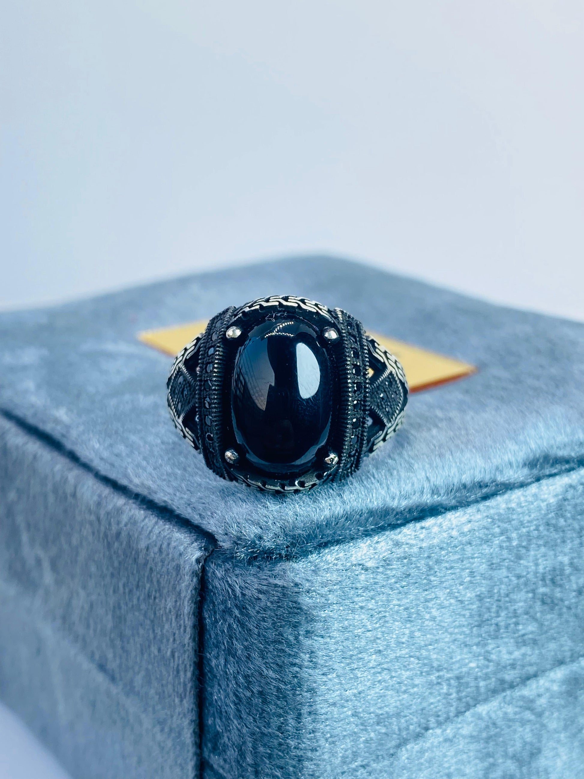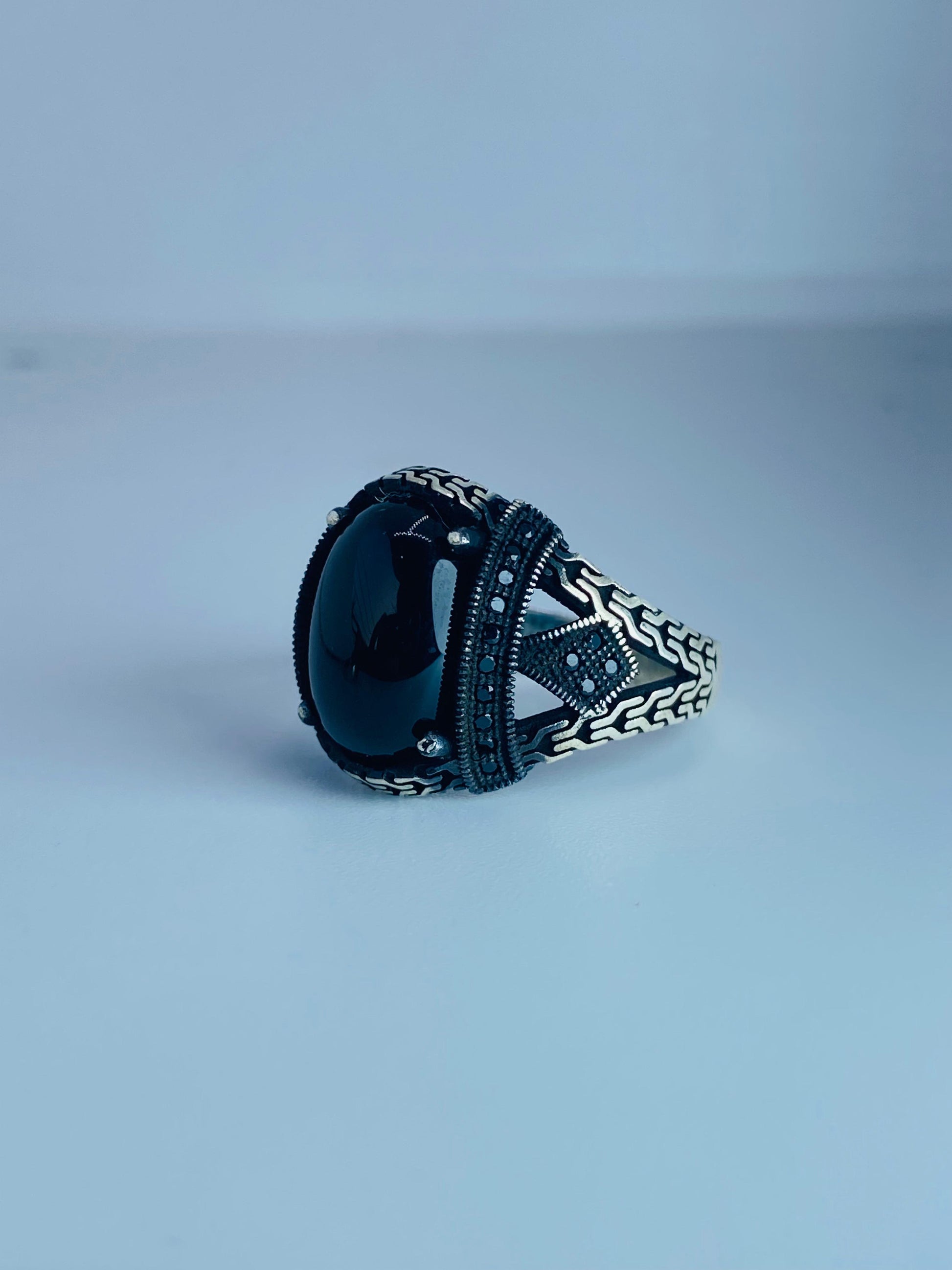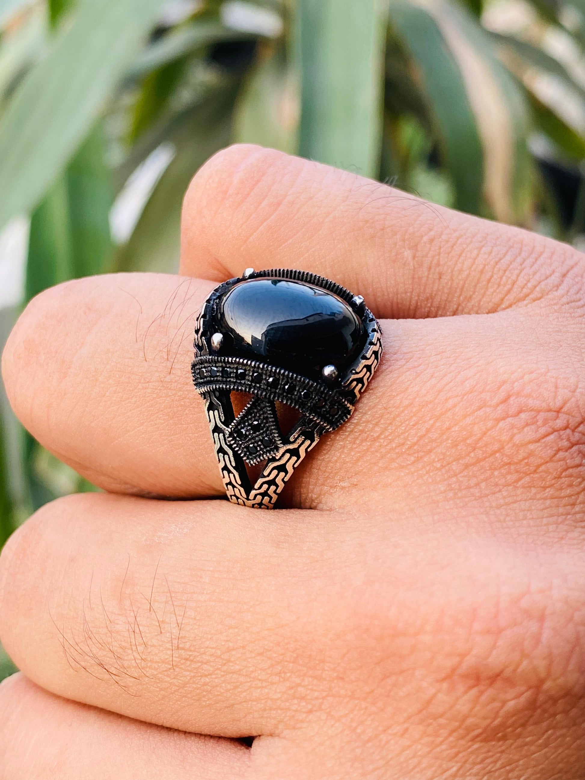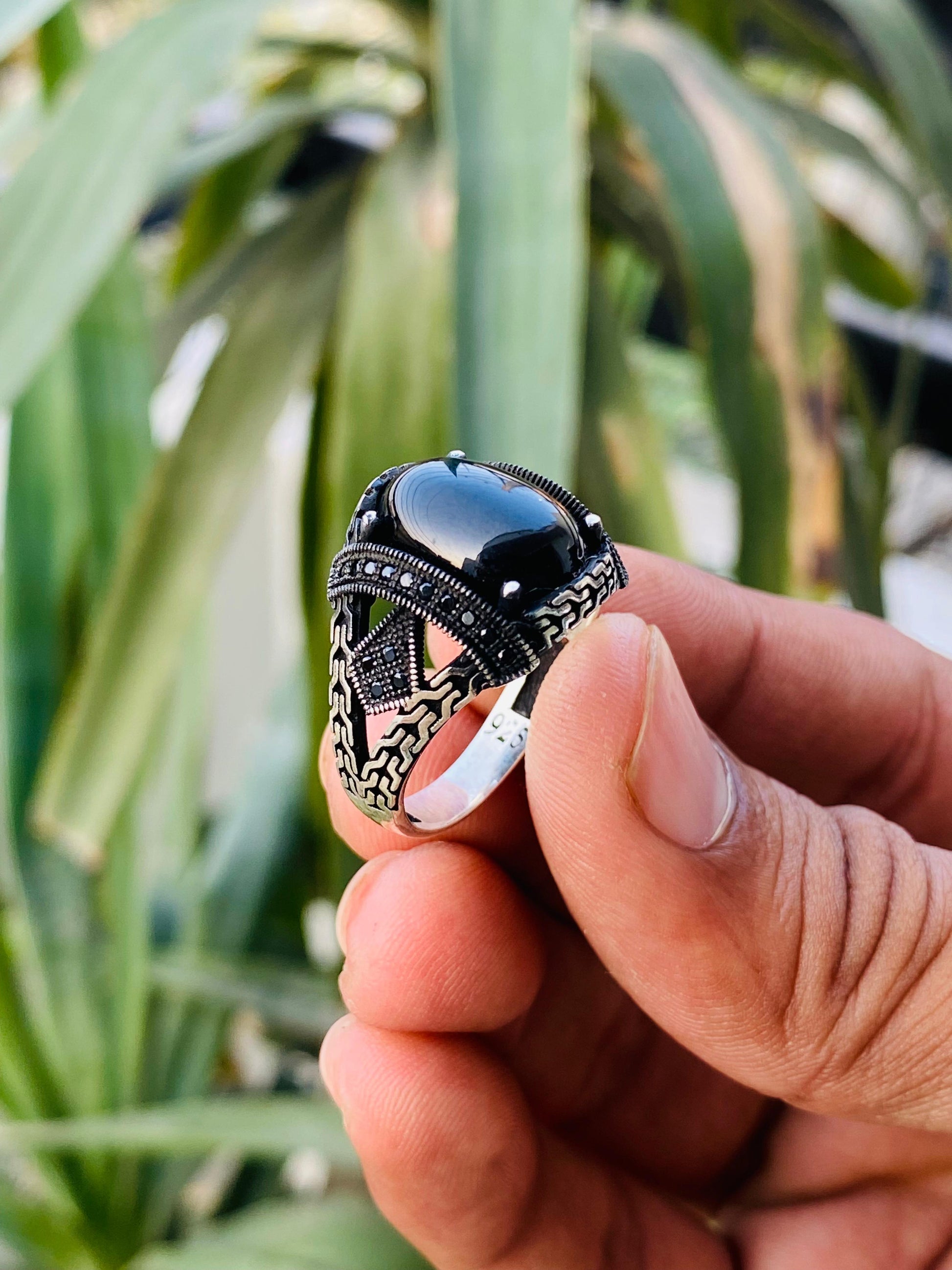 a pure chandi (silver) ring that exudes sophistication and tradition. This handcrafted masterpiece features two striking gemstonesβ a captivating green stone and a rare black Yamini Aqeeq. The green stone adds vibrancy, while the black Aqeeq is known for its spiritual protection. Intricate designs are etched into the sides of the band, offering both elegance and masculinity. Perfect for those who appreciate a mix of tradition and luxury, this ring is an ideal choice for daily wear or special occasions. Crafted with precision and designed for comfort, Zewar-e-Shahbaz is a timeless accessory.