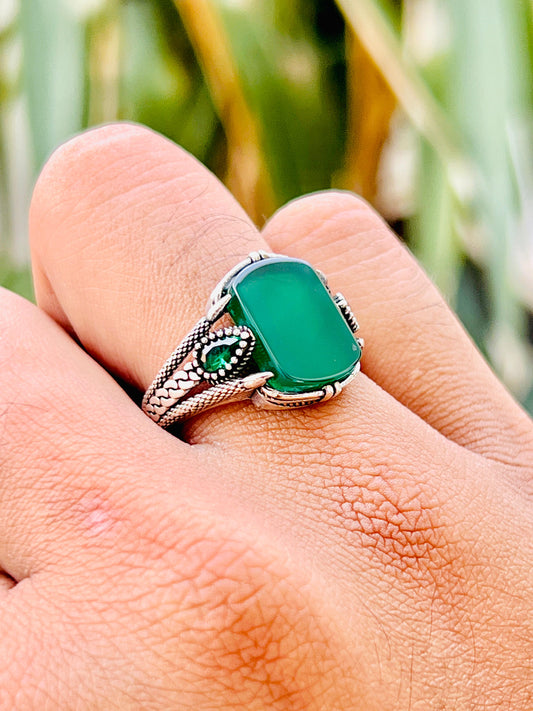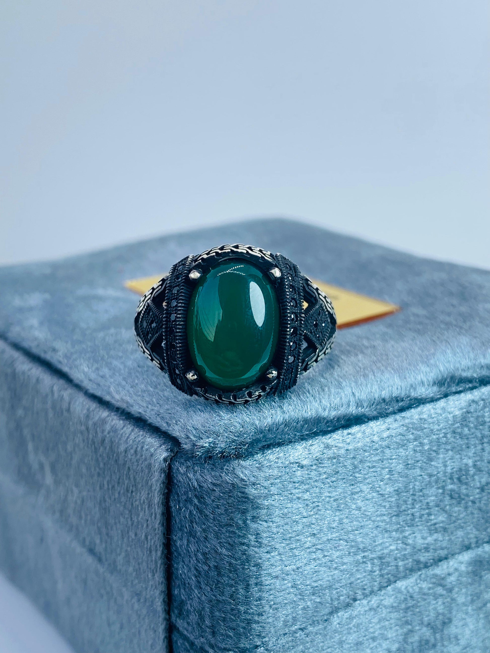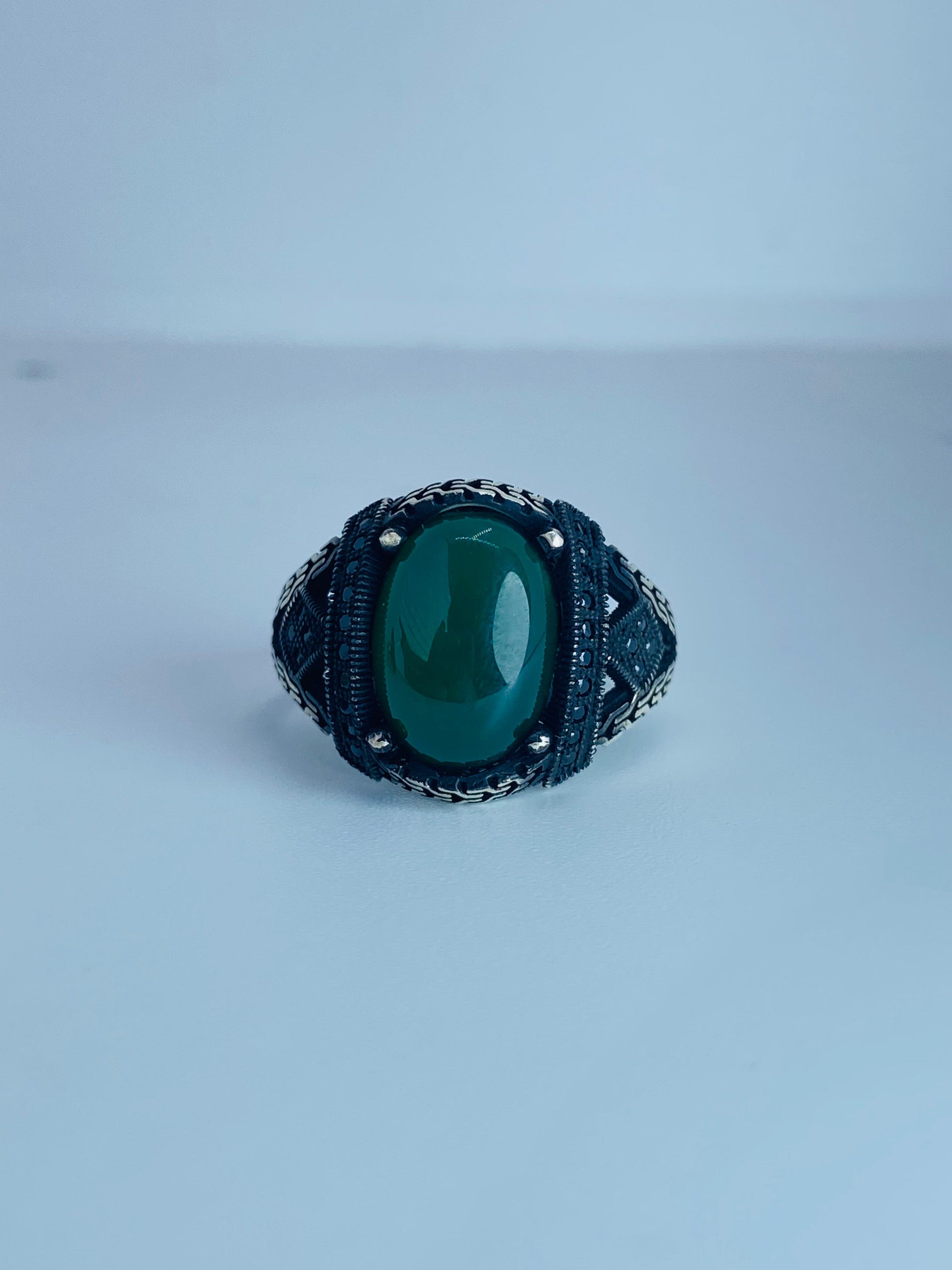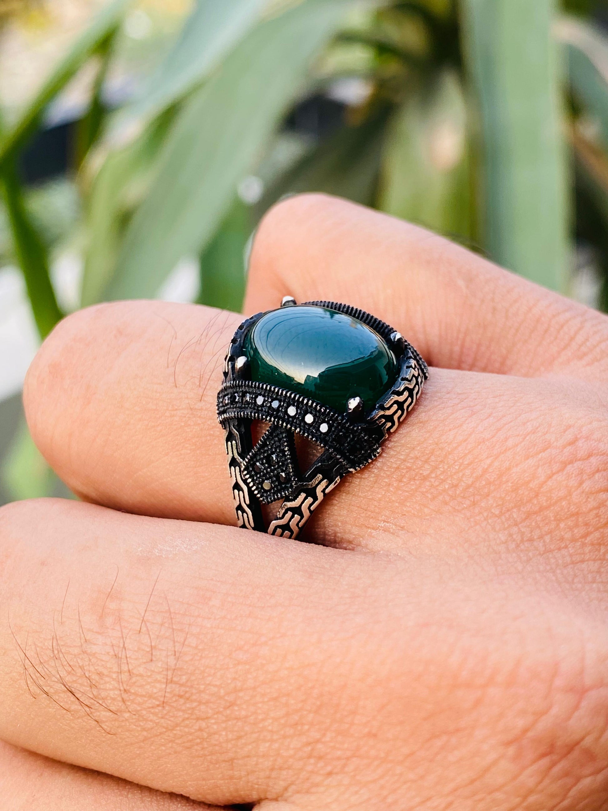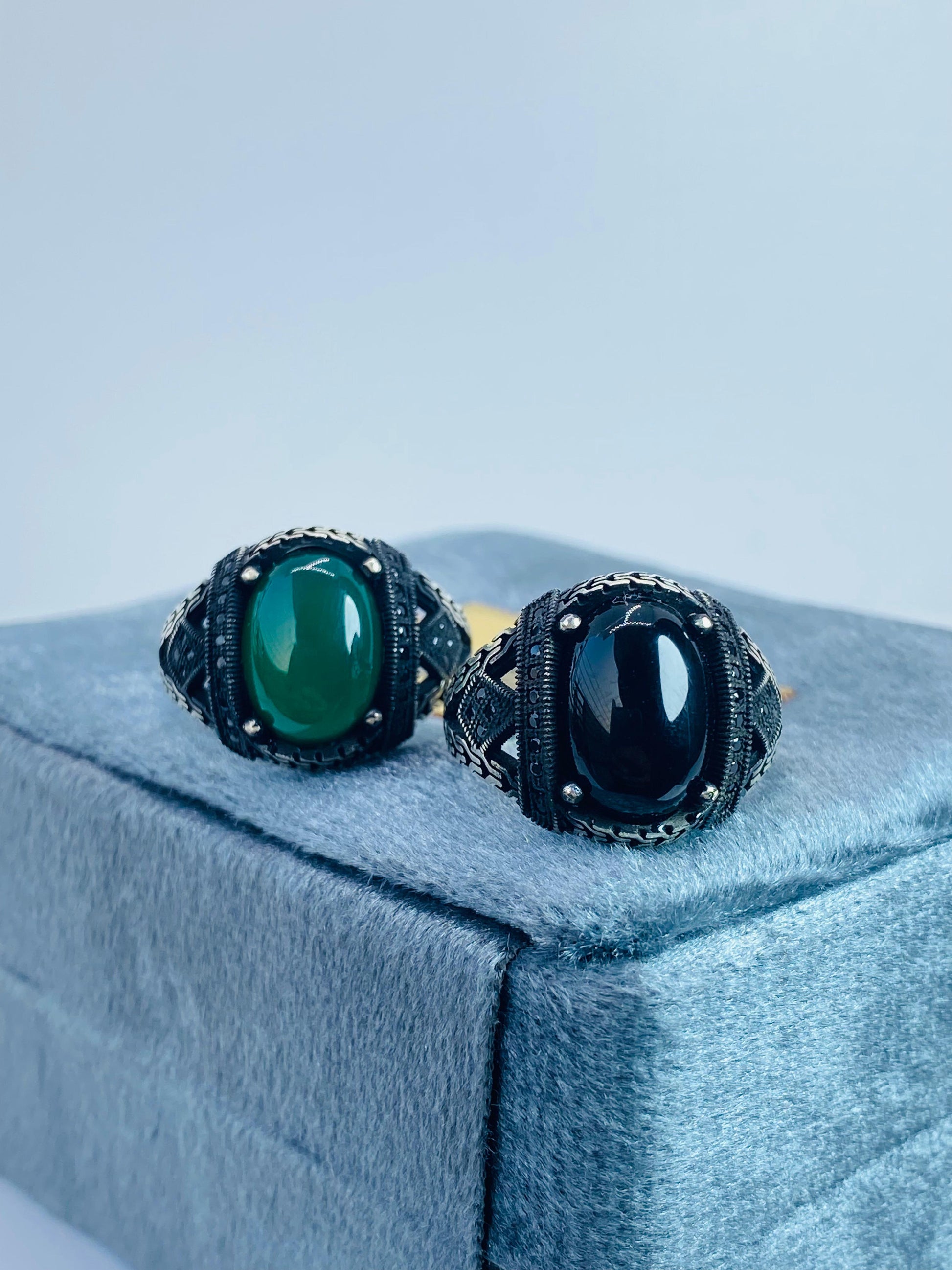 Zewar-e-Shahbaz: Pure Chandi Ring with Green and Black Yamini Aqeeq | Handcrafted Men's Silver Ring